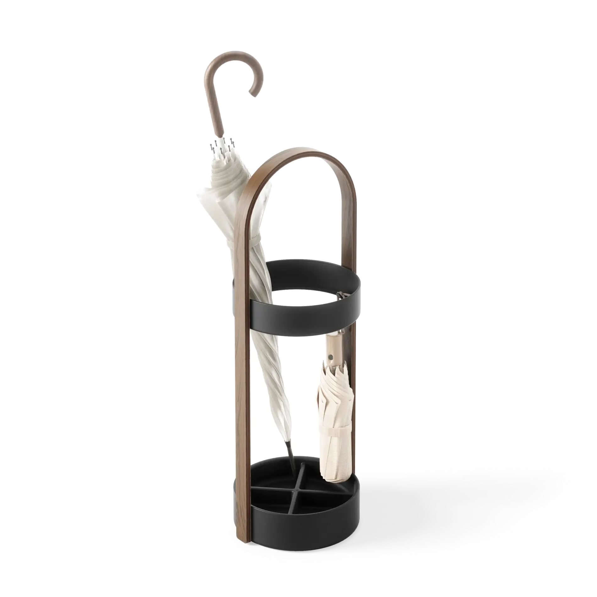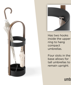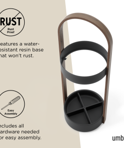 The Bellwood Umbrella Stand is durable as it is stylish thanks to its beautiful and shape and resin base, which is water-resistant and prevents rusting. Featuring a round base and a curved wood veneer handle with an upper ring made of steel. This piece is easy to assemble and includes all hardware. Its slots will hold your tall umbrellas with ease and its tiny hooks on the top of the ring will hold your more compact, short umbrellas. Measuring 8.63 x 9.63 x 26.88 inches (22 x 24 x 68 cm) this stylish piece will fit neatly into many different spaces and styles of décor. Sourced from renewable wood sources. Wood is a unique natural material with variations in tone, texture, and grain. The product may vary from our imagery. ⓘ For Best Care: wipe with a clean damp cloth