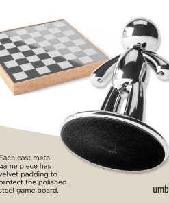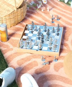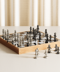 Buddy Chess Set is an elegant addition to any space, able to serve as eye-catching decor when not in use. It sports polished black and charcoal tiles and cast zinc chess pieces with nickel and titanium finishes. The board’s glossy coating, in combination with the velvet lining under the individual pieces allows for optimal movement of the Buddy chess pieces. Measuring 14 x 14 x 2.25″ (36 x 36 x 6 cm), this chessboard is both a practical size for chess games, and able to be easily packed away for hassle-free storage. Wood is a unique natural material with variations in tone, texture, and grain. The product may vary from our imagery. Each metal piece is carefully and individually polished by hand, ensuring that every item has its own unique character and shine. Slight variations or inconsistencies in the finish may occur due to the handmade nature of the product.