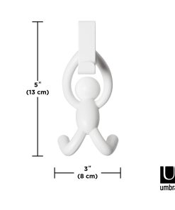 Another fun addition to the Buddy Collection, the Buddy OTD Cabinet Hook are single over the door hooks featuring Umbra’s classic Buddy figurine. Utilizing unused storage space, these over the door cabinet hooks are the perfect playful space-saving solution for creating easy access to towels or other items. Buddy OTD Cabinet Hook features an extra built-in hook on the inside of your cabinet door and cushioning EVA foam pad to improve fit while protecting the cabinet door surface. These useful hooks help to organize your counter space while ensuring articles stay in place with its rubber non-slip tip and bar. Fits most standard kitchen or bathroom cabinet doors. Measures 2.25 x 3 x 5.13 inches (6 x 8 x 13 cm). Made with recycled plastics and with an eco-friendlier finish. It produces 85% less water and solid waste than traditional electroplating finishes. Each hook holds up to 5 lbs (10 lbs total).