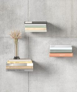 Conceal Shelves come in a set of 3 powder coated silver floating bookshelves that become invisible behind a stack of books, transforming the books into a work of art. The shelves have flexibility in the mounting formation and can be displayed as a group or separately, linear in orientation or staggered. Conceal has a small lip to hold the book cover from falling and give off the illusion of a floating shelf. The set is space-saving and can fit into awkward wall spaces to securely nestle your books. Coming in a sheen silver finish, Conceal can integrate seamlessly into any space, adding dimension. The small shelf size measures at 5.5 x 5.25 x 5.5 inches (14 x 13 x 14 cm) and hold up to 15 pounds (7 kg). The larger shelf measures 7 x 6.75 x 5.5″ (18 x 17 x 14 cm) and holds up to 20 pounds (9 kg). This shelf is made with an eco-friendlier finish. It produces 85% less water and solid waste than traditional electroplating finishes.