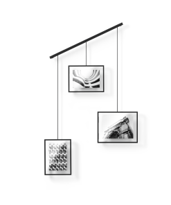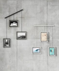 Exhibit Photo Display features a wall-mounted brushed metal ledge with clips and brackets to hold three gallery-style picture frames of various size, all while reducing the amount of damage typically left on walls. The brackets with the frames are suspended from the ledge, which allows them to be moved around to create various layouts. Its flexible horizontal hanging properties make Exhibit a great addition to your stairway due to its ability to be hung angled. Use Exhibit to set a décor accent in your living room, bedroom, entryway, office or studio and give it a modern update while curating your favorite photos and artwork. Exhibit is customizable to your layout preference. The picture frames can be moved around the metal ledge and rotated to a landscape or portrait orientation. Exhibit features two 4×6 and one 5×7 picture frames to fit all of your favorite photos, artwork, illustrations and more. Complementary to multiple decor styles, Exhibit makes is a beautiful wall decor piece that allows you to change out images easily to refresh your room any time you want. This picture frame is made with an eco-friendlier finish. It produces 85% less water and solid waste than traditional electroplating finishes. Measures 26.38 x 18 x 1 inches (67 x 46 x 3 cm).