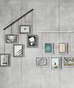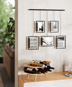 Upgrade your wall decor with Exhibit Photo Display. This modern, wall-mounted ledge includes clips and brackets to securely hold five gallery-style frames (two 4×6 and three 5×7). The frames hang from the ledge, so you can easily create layouts that suit your space, whether straight, angled, portrait, or landscape. Swap out photos anytime to refresh your look, all while minimizing wall damage. Perfect for stairways, living rooms, bedrooms, and more, Exhibit adds a fresh, contemporary touch to any room.