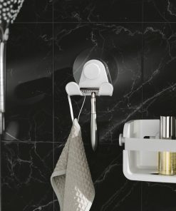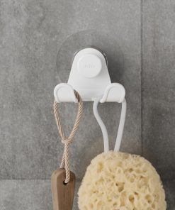 Keep your small bath necessities elevated and easy to access with Flex Adhesive Double Hook. This storage hook is made of durable plastic, so it’s easy to clean, and you’ll never have to worry about it rusting. Easy to install, Flex Adhesive Double Hook includes non-damaging, waterproof adhesive strips that can be applied on various surfaces such as tiles, drywall, concrete, etc. (does not work on porous surfaces). Flex Adhesive Double Hook is great for slim shower stalls where storage is limited. One simple hook can make a big difference by providing access to the items you need in the shower. Made to hang two loofahs or washcloths, or a razor, it can also be used on the reverse side of a smooth glass shower stall to hang larger towels, a bathrobe, etc. Measures 3.13 x 2.25 x 3.13″ (8 x 6 x 8 cm). Part of Umbra’s Flex Adhesive Bath Collection. ♻️ Made from 90% recycled plastic. ⓘ Non-Damaging Adhesive Installation: Completely non-damaging to your tiled walls. Includes a strong adhesive backing that can be applied on various surfaces such as tiles, drywall, concrete, etc. Surfaces must be smooth and clean for mounting. Warning: Surface damage may occur if adhesive mounting is removed from drywall, concrete, wallpaper, and porous surfaces.