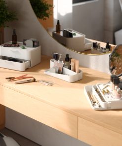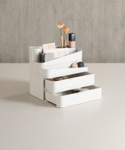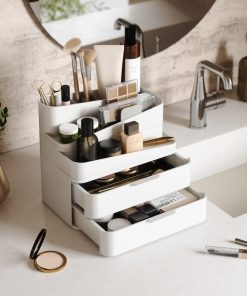 Create the ultimate beauty station setup with Glam Large Organizer. Inspired by our original Glam Hair Tool & Cosmetic Organizers, this new addition features three drawers for maximum organization, and can be used for everything from makeup and skincare to office accessories. The modular organization system means you can stack it or use it separately, and the customizable/removable dividers give you extra flexibility for items like palettes, brushes and more. The rubber feet keep the organizer in place, while preventing damage to your tables or countertops. Glam also makes the perfect gift for any friend or family member – keeping makeup and skincare products all in one convenient and organized place. Made with recycled plastic. Measures 10.50 x 7.25 x 9.75″ (26.7 x 18 x 25 cm). ⓘ Plastic material can react to chemicals such as alcohol, acetone, benzene, toluene and cause cracks and discoloration. Clean with water only