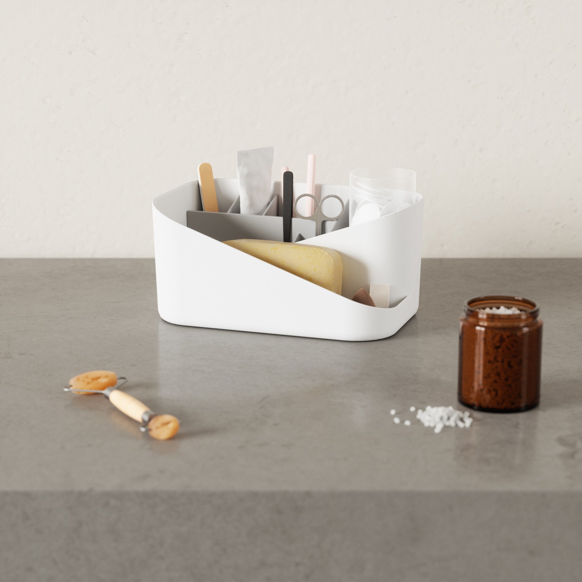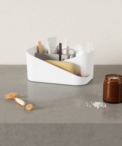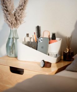 Instantly de-clutter your space with Glam Cosmetic Organizer. This makeup organizer provides storage for your everyday makeup essentials with different sized storage compartments and a removable insert. With an open-top design, Glam provides easy-access storage, while being able to showcase all of your products. Glam can be placed under the sink or on your vanity or countertop for space-saving organization. Pair Glam with its coordinating Hair Tool Organizer for a complete set and great gift. Measures 10.5 x 6.75 x 5″ (27 x 17 x 13 cm). ⓘ Plastic material can react to chemicals such as alcohol, acetone, benzene, toluene and cause cracks and discoloration. Clean with water only.