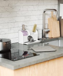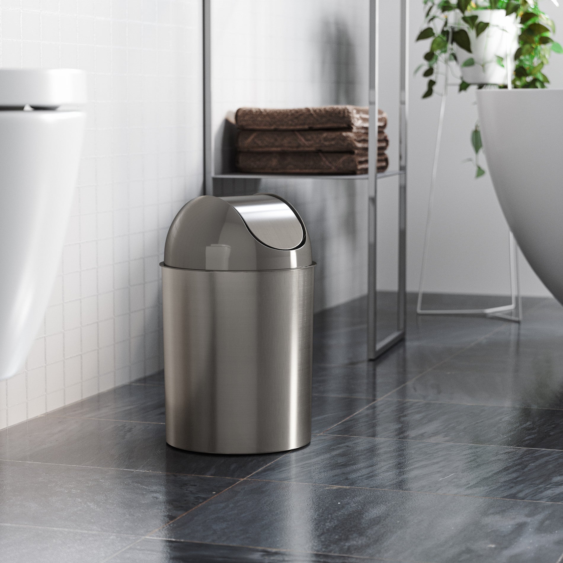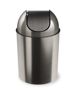Mezzo Trash Can is a sleek trash can, giving the appearance of brushed metal, without the weight or maintenance. Its material ensures Mezzo is durable and long-lasting. The swing-top lid helps conceal garbage contents and odor. Mezzo is rust proof, dent proof, waterproof and easy-to-clean, and holds up to 2.5 gallons (9L). The can is miniature and geared towards small spaces, measuring at 15″ (38 cm) tall with a 9″ (23 cm) diameter.