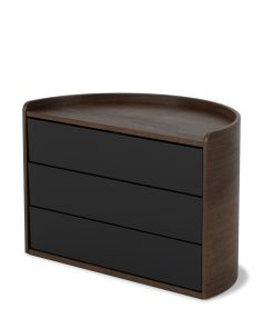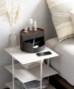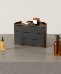 Moona features round, circular shapes for a one-of-a-kind jewelry organizer. Both decorative and functional, Moona has a large display top that doubles as a tray for smaller accessories, perfume, small plants or other items. Its three rotating drawers can provide hidden storage or be pushed out for easy access. With its unique semi-circle shape and beautiful wood accents, Moona can be displayed on your vanity, counter, dresser, desk and more. Made with recycled plastics and sourced from renewable wood sources. Wood is a unique natural material with variations in tone, texture, and grain. The product may vary from our imagery. ⓘ For Best Care: wipe with a clean damp cloth