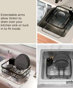 The Sinkin is an in-sink dish drying rack by Umbra that rests in the bottom of the kitchen sink for a tidy and convenient place to drip-dry dishes and glasses. Constructed of metal wire and durable polypropylene, Sinkin features non-slip rubber feet that won’t scratch the sink surface. Best of all, it can sit in or out of the sink to dry dishes. Measures 14.37 x 11.3 x 5.48″ (36 x 29 x 14 cm) and fits most standard kitchen sinks. This in-sink dish drying rack is made with an eco-friendlier finish. It produces 85% less water and solid waste than traditional electroplating finishes.