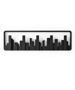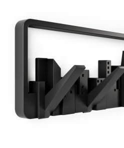 A piece of wall art that unexpectedly transforms into a collection of hooks that can be used for hanging scarves, accessories, bags and coats. This piece is designed to look like a window on a wall, with flip down hooks built into the skyline that hold up to 5 lbs. each. Made with recycled plastics.