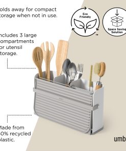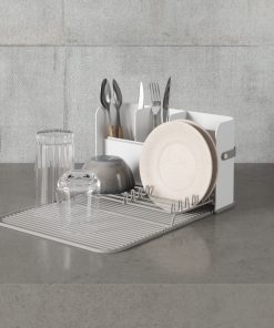 Introducing SLING DISHRACK: the space-saving and efficient solution for your dishes. This easy-to-use and durable dishrack is designed to maximize capacity while minimizing clutter. The SLING DISHRACK features a metal foldaway rack and a folding mat that fits perfectly into a convenient caddy base. The base has three divided sections for your cutlery, large utensils, or dish cleaning accessories like sponges and scrub brushes. Not only is the SLING DISHRACK incredibly functional, but it’s also portable. It folds away for easy storage when you’re not using it, and it’s perfect for taking on camping trips. To keep everything in place, a silicone band wraps around the caddy base and holds up the mat and rack when they’re not in use. Get organized with SLING DISHRACK today. Measures 12.87 x 15.02 x 6.77″ (33 x 38 x 17 cm). Made with recycled plastic and included mat is dishwasher-safe. ♻️ Made from 50% recycled plastic.