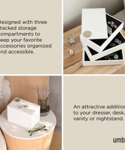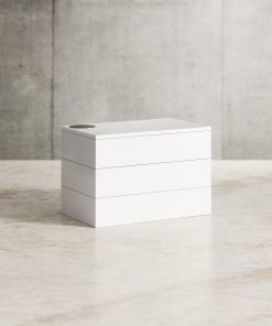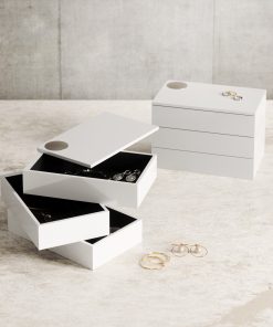 Use Spindle to keep all your favorite jewelry pieces in one place, making them easy to access. Three hidden compartments allow you to store your rings, earrings, bracelets, watches, necklaces and other accessories in different configurations, depending on what works best for you. Each drawer is lined with soft fabric to keep your jewelry from moving around or getting damaged. The simple, modern pivoting design of Spindle is an attractive addition to your dresser, nightstand, desk or wherever you choose to put it. Spindle has a white, high-gloss finish and has a soft fabric lining underneath to prevent your furniture from getting scratched. Measures 7.5 x 4.64 x 5 inches (19 x 12 x 13 cm).