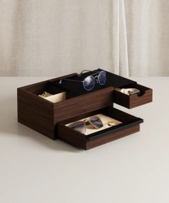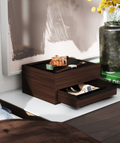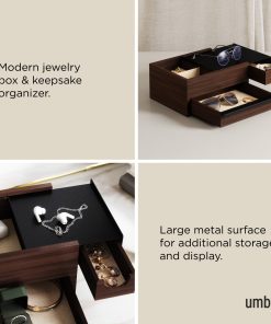 Stowit is more than just a jewelry box — it’s a cleverly designed storage solution that keeps your favorite pieces organized, protected, and always within reach. Hidden compartments and smooth sliding drawers make it easy to tuck things away, while the soft linen lining keeps your jewelry safe from scratches and tangles. Its clean lines and modern mix of wood and metal make Stowit a standout on any dresser, nightstand, or vanity. And thanks to the rubber feet on the bottom, it stays put and won’t leave a mark on your surfaces.Crafted from renewable wood and finished using an eco-friendlier process that generates 85% less water and solid waste than traditional methods, Stowit is designed with both style and sustainability in mind. The product may vary from our imagery. Measures 10.2 x 8.7 x 4.7″(26 x 22 x 12 cm) ⓘ For Best Care: wipe with a clean damp cloth