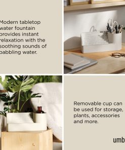 Introducing the Umbra Stream Water Fountain – modern style and convenience meet relaxation! This tabletop fountain offers more than just ambiance to any home or office space; it also helps improve air quality by adding moisture to dry air. The internal MAX/MIN water line indicates how much water is needed to smoothly run the Stream Water Fountain. Keeping water within these lines controls the level of sound creating the gentle, soothing trickle of water. The Stream has plenty of room for 3.5″ planters or stationaries, so you can add elements to this piece that will complement your décor perfectly. Since it’s powered by a simple USB plug, you won’t have to worry about cords and can easily control it with the on/off switch on the cord. Will run for 50 hours between refills at max water line. Measures 12.5 x 4.5 x 5.38″ (32 x 11 x 14 cm). ⓘ Do not place on surfaces or tabletops that have potential to be water damaged. The Stream Water Fountain is composed of recycled plastic with a recycled mixed wood fiber, adding a natural texture to the surface. This material is easy to clean, and long lasting. For consistent water flow, we recommend allowing the water to run for a few days. If you are hearing the motor, ensure you are keeping water within the min-max line. If motor starts grinding, STREAM needs to be topped up with more water.