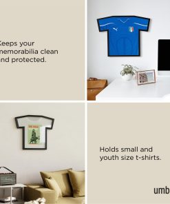 This unique T-Shirt display case is made to showcase your favorite sports, concert, graphic or athletic t-shirts. Since it’s shaped like a t-shirt, you can easily fold your shirt into the frame for a compact display that will keep it looking pristine. Included is a folding guide allowing you to align your shirt perfectly in the frame. With this quick and easy to use solution, you don’t have to worry about your shirt sagging in a shadowbox, or being unprotected outside a frame. Made with shatter-proof acrylic your t-shirt will be safe and dust-proof behind this wall display. Simply fold your t-shirt on the built-in folding template and then place the jersey inside the frame. Umbra’s T-Frame is available in a small 21.5 x 1.13 x 19.75″ (55 x 3 x 50 cm), medium 28.5 x 1.25 x 24.5″ (72 x 3 x 62 cm), size to accommodate your different t-shirts and jerseys. We strongly recommend you measure the portion of your t-shirt which you intend to display PRIOR to ordering to ensure it will fit correctly. Made with recycled plastics.