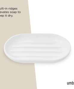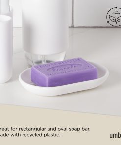 Touch Soap Dish by Umbra is a sleek and compact soap dish that will look great sitting out on your counter, thanks to its soft-touch finish, rounded edges, and curved shape. Its built-in ridges will keep your soap bar dry, elevating it above the bottom of the dish, so it dries fast and stays dry, instead of pooling water. Touch Soap Dish is made of a matte, soft-touch molded material, which is easy to clean, and highly durable. The finish is both luxurious and pleasing to the eye. Compact, it measures 5.5 x 3.38 x 0.88 inches (14 x 9 x 2 cm). Match this soap dish with other products from the Touch Bath Collection for a cohesive look. Made with recycled plastics.